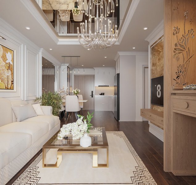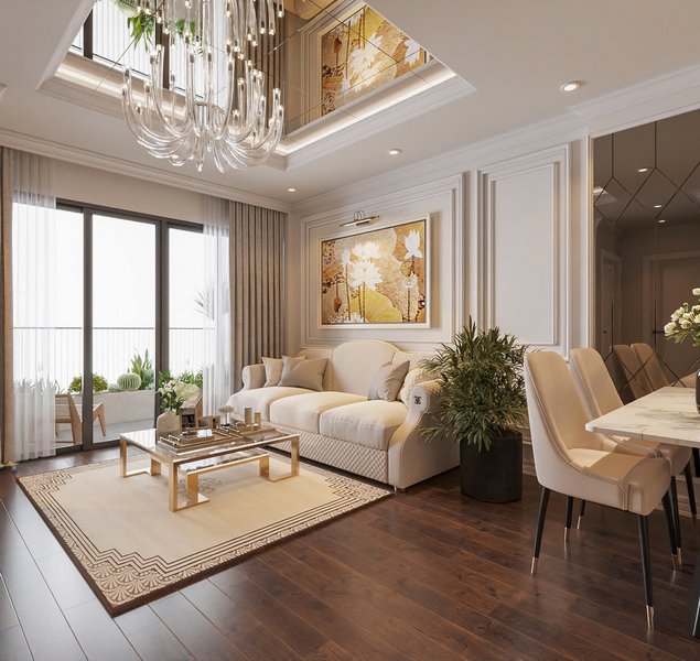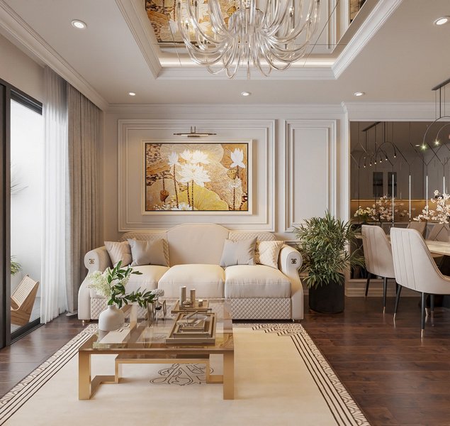 – Màu sắc chủ đạo: Phòng khách sử dụng gam màu sáng như trắng và kem làm màu chủ đạo, kết hợp với các chi tiết màu vàng kim của nội thất, mang lại vẻ sang trọng và rộng rãi. Những chiếc đèn chiếu sáng và bộ sofa trắng tinh tế góp phần tạo ra không gian thoải mái, nhẹ nhàng.