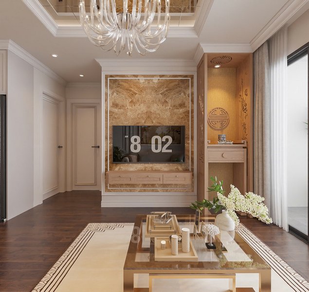 - Ánh sáng và không gian: Phòng khách được chiếu sáng tốt với đèn trần hiện đại, đặc biệt là đèn chùm pha lê ở trần. Cửa sổ rộng lớn giúp ánh sáng tự nhiên chiếu vào, làm cho không gian trở nên sáng sủa và dễ chịu.