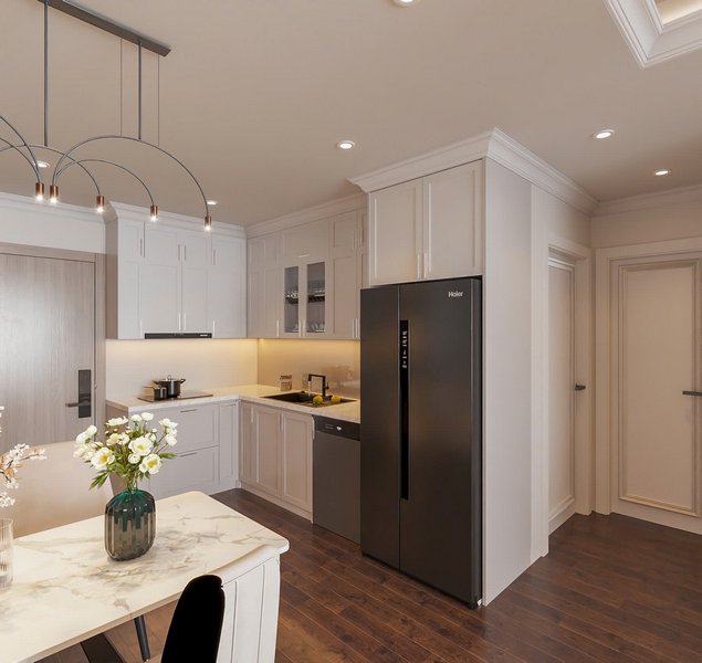 Tân cổ điển kết hợp hiện đại: Phòng bếp sử dụng màu sắc chủ đạo là trắng và kem kết hợp với các chi tiết kim loại, tạo cảm giác sang trọng và hiện đại. Các chi tiết tủ bếp, đèn chiếu sáng và vật dụng trong bếp đều có sự tinh tế, không quá cầu kỳ nhưng vẫn toát lên vẻ sang trọng.