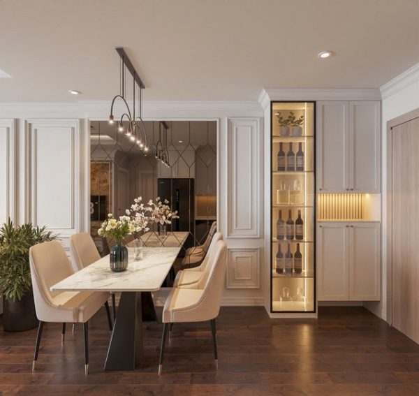 Tủ bếp và kệ rượu: Tủ bếp màu trắng với các chi tiết tinh tế, hiện đại, kèm theo kệ rượu có ánh sáng nhẹ nhàng bên cạnh. Việc sử dụng ánh sáng phía dưới kệ rượu không chỉ giúp không gian thêm phần sang trọng mà còn tạo cảm giác ấm cúng, dễ chịu.