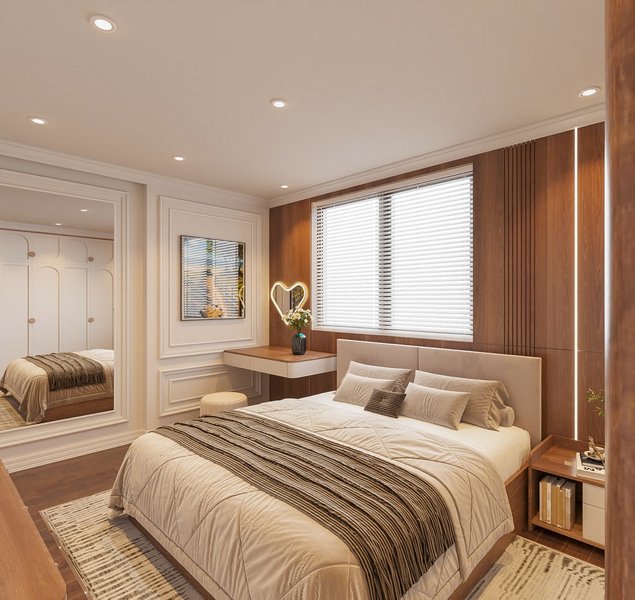 Màu chủ đạo là nâu gỗ kết hợp kem sáng, tạo cảm giác ấm cúng, thư giãn nhưng vẫn hiện đại và tinh tế.