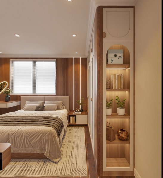 Tủ quần áo âm tường và kệ trang trí có đèn hắt làm điểm nhấn, tiết kiệm diện tích mà vẫn thẩm mỹ.