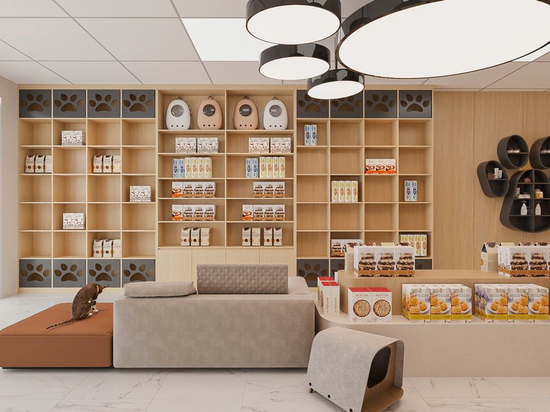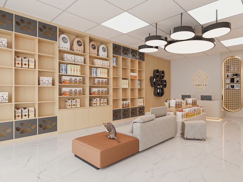 - Kệ mini paw-print phía sau quầy trưng bày “Sản phẩm bán chạy” – tạo điểm nhấn thị giác ngay khi khách bước vào.