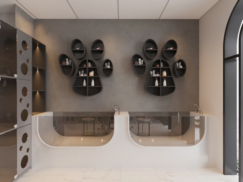 - Kệ paw-print lớn (1,5 m) treo tường xi-măng thô – trưng bày sản phẩm spa (dầu xả, mặt nạ lông).