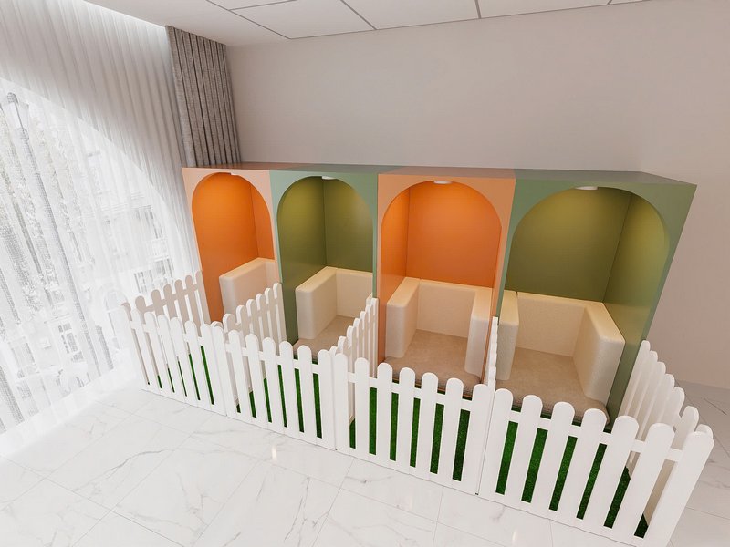 - Vách cong sơn màu pastel (cam nhạt – xanh matcha xen kẽ), mái vòm đèn LED ấm 3000K.