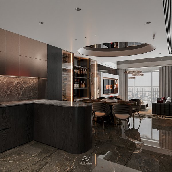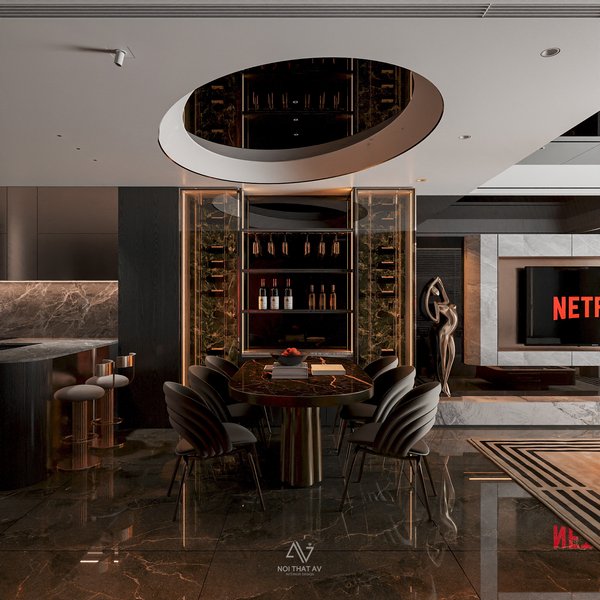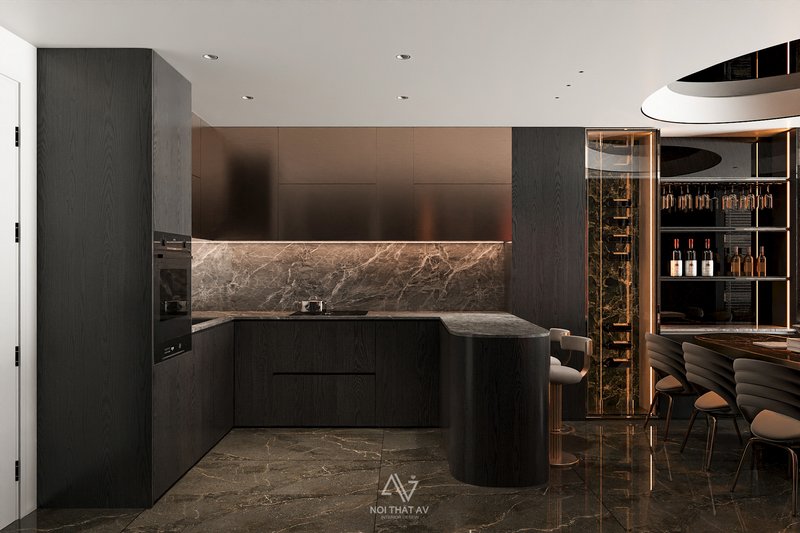 Đèn LED hắt sáng dưới tủ và hệ thống chiếu sáng trần tạo chiều sâu cho không gian. Các chi tiết kim loại mạ đồng ở chân ghế và viền tủ rượu giúp tăng thêm vẻ sang trọng.