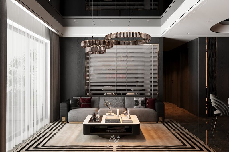 Không gian sử dụng tông màu trung tính chủ đạo (đen, xám, trắng, nâu gỗ), tạo nên vẻ đẹp đẳng cấp, mạnh mẽ nhưng vẫn tinh tế.