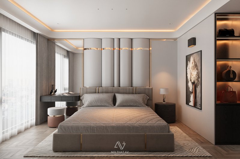 Mảng tường đầu giường được bọc nệm chia khối dọc kết hợp viền kim loại ánh đồng mang đến điểm nhấn sang trọng, tinh tế và hiện đại.