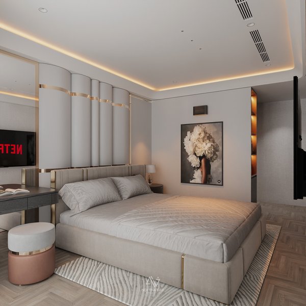 Hệ thống đèn LED hắt trần cùng đèn đầu giường giúp tạo không khí ấm áp, dễ chịu và tôn lên đường nét nội thất