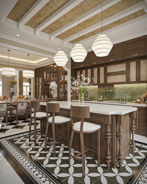 Nhà bếp: Đây là nơi chất Indochine thể hiện rõ nét nhất qua việc sử dụng vách tủ gỗ kết hợp mây tre đan. Điểm nhấn màu xanh rêu từ gạch thẻ ốp bếp (backsplash) mang lại cảm giác tươi mát, mộc mạc nhưng vẫn rất thời thượng.