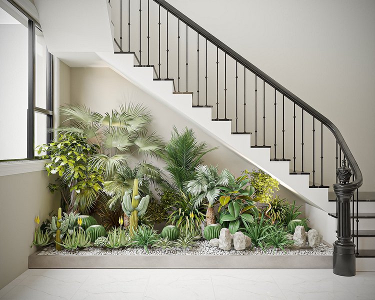 Góc xanh dưới cầu thang: Việc thiết kế một tiểu cảnh xương rồng và cây xanh ngay dưới gầm cầu thang là một giải pháp tuyệt vời để mang thiên nhiên vào nhà và hóa giải không gian chết.