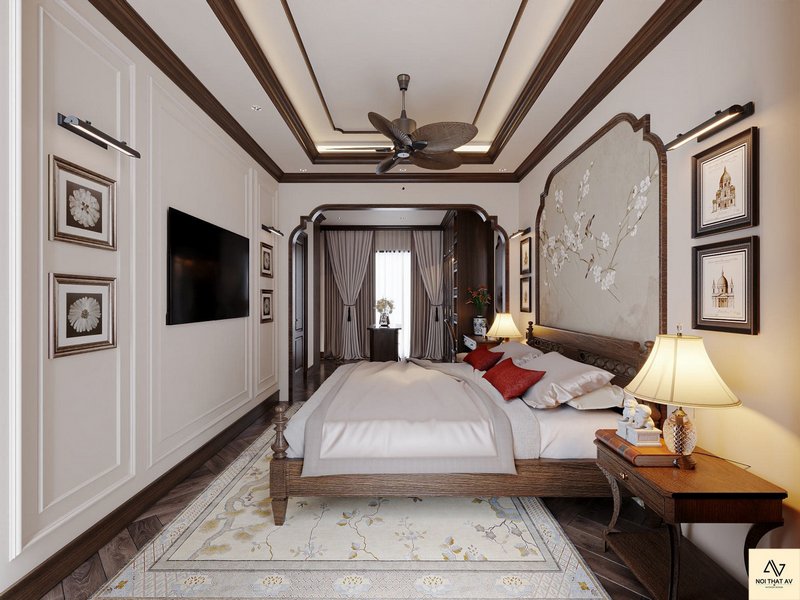 Ánh sáng: Xuyên suốt ngôi nhà là hệ thống đèn âm trần phối hợp cùng đèn hắt khe (cove lighting) giúp các đường gờ chỉ và họa tiết gỗ trở nên sống động hơn vào buổi tối.