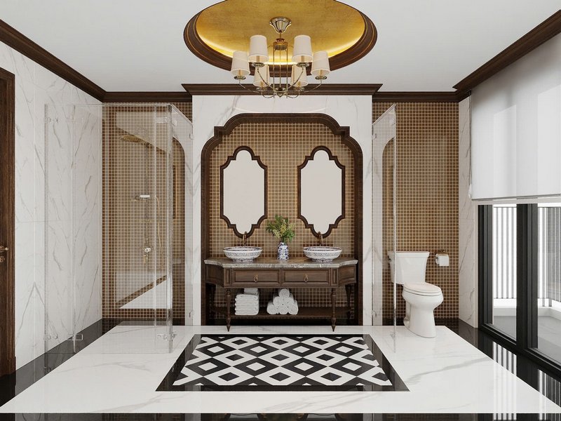 Vật liệu: Gạch mosaic màu nâu ấm kết hợp với lavabo gốm sứ hoa văn truyền thống trên nền đá marble trắng tạo nên sự tương phản đầy thú vị và sang trọng.