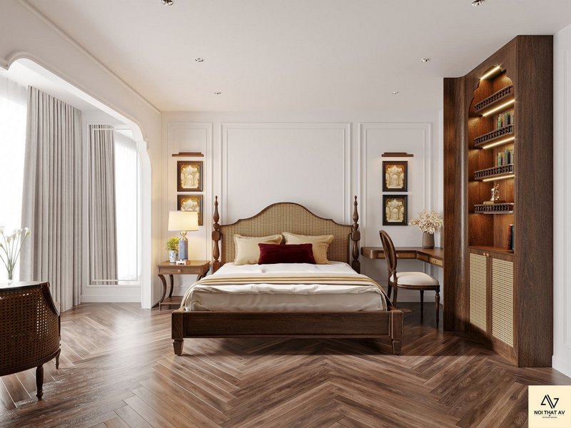 Sàn nhà: Việc sử dụng sàn gỗ lát kiểu xương cá (herringbone) mang lại sự ấm áp và chiều sâu cho không gian.