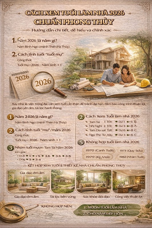 Vậy cách xem tuổi làm nhà năm 2026 như thế nào cho đúng? Cần kiểm tra những yếu tố nào? Nếu không hợp tuổi thì có giải pháp gì? Bài viết dưới đây sẽ hướng dẫn chi tiết từ A–Z để bạn có thể tự kiểm tra một cách chính xác và đầy đủ.
