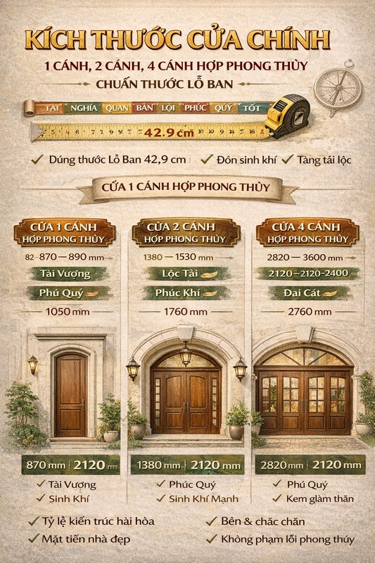 Trong thiết kế chuyên nghiệp, cửa chính không được chọn theo cảm tính, mà luôn phải kết hợp tỷ lệ kiến trúc – thước Lỗ Ban – công năng sử dụng.