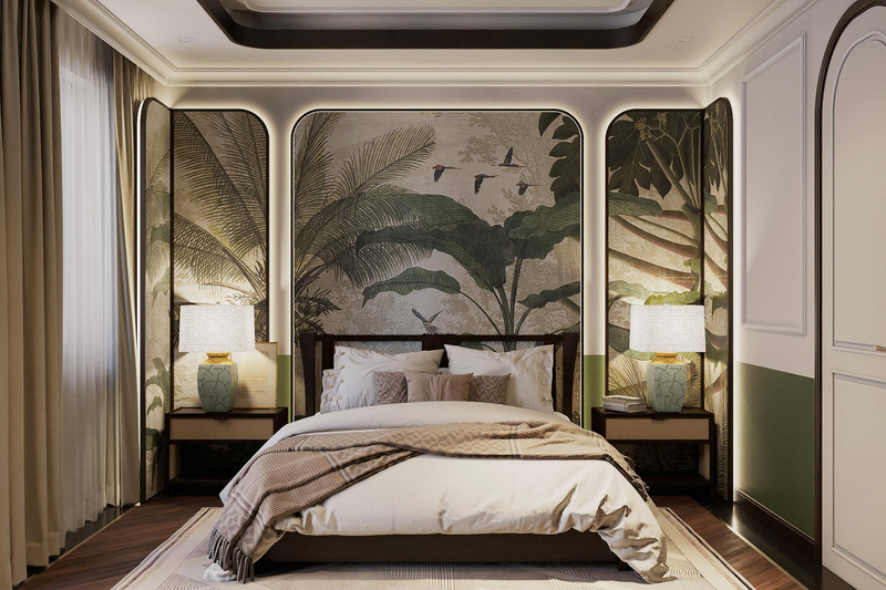 Phòng ngủ phong cách thiết kế nội thất Đông Dương Indochine thường sử dụng gam màu vàng nhạt, màu vàng kem là chủ đạo. Bên cạnh đó điểm nhấn sẽ là màu cam hoặc màu xanh lá,… Nội thất phòng ngủ thường sử dụng chất liệu gỗ tự nhiên vừa đảm bảo tuổi thọ của vật dụng, vừa đem lại cảm giác ấm cúng cho không gian