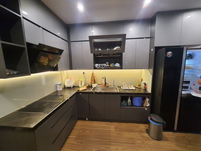 Tủ bếp Gỗ công nghiệp MDF cốt xanh chống ẩm An Cường, Cánh bề mặt phủ Acrylic no-line màu xác nhận…. Khung chậu rửa sử dụng gỗ nhựa Picomat kháng nước. Phụ kiện tiêu chuẩn ray bi, bản lề giảm chấn Inox hãng Cariny