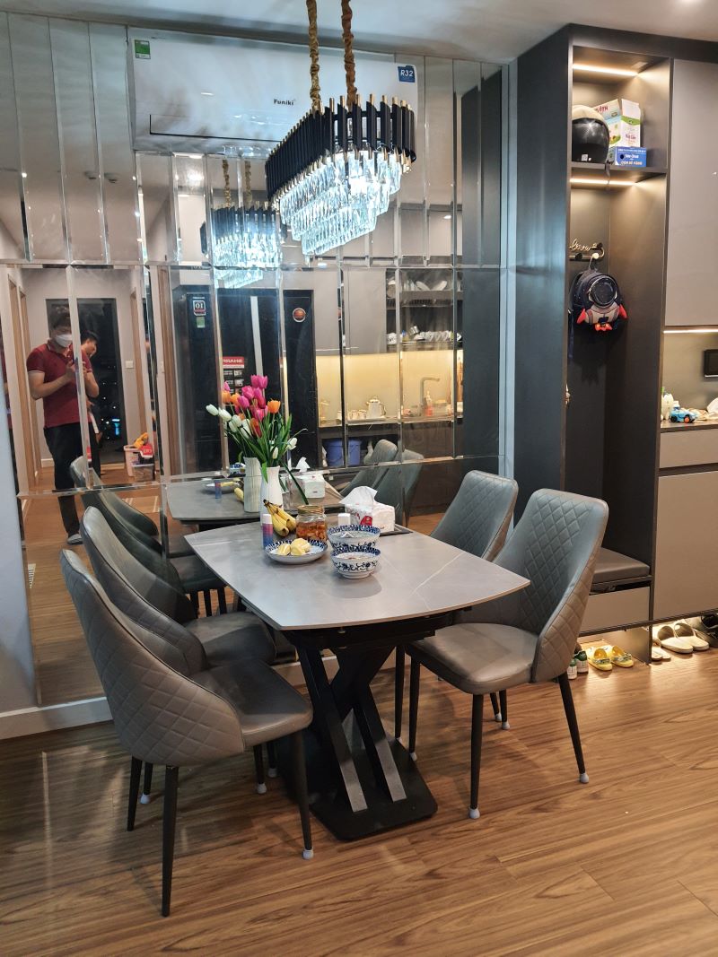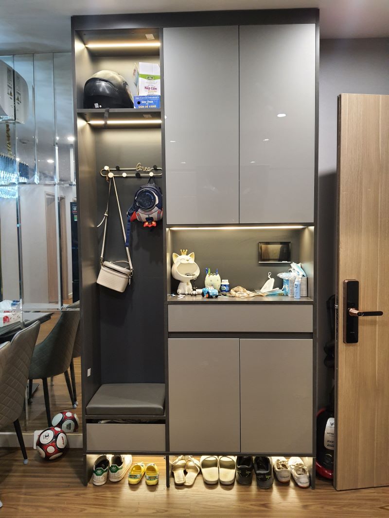 View 02 Bàn ăn và Hệ tủ giày sảnh chào Chung cư Vinsmart City. Gỗ công nghiệp MDF cốt xanh chống ẩm An Cường, bề mặt phủ Melamin màu xác nhận…. LED màu xác nhận mẫu 120b/md khung nhôm định hình