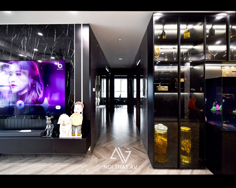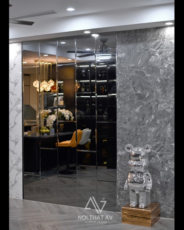 Thẳng tủ rượu, bể cá sang phòng khách là phần tường ốp gương (từ gương phản chiếu bể cá) kết hợp 2 bên là pvc bóng giả đá nhựa đúc, gỗ mdf phủ melamin giả vân đá