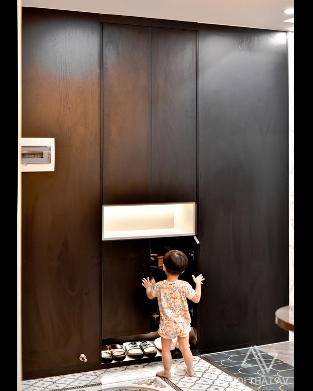 Từ ngoài bước vào nhà sẽ thấy ngay tủ giày và không gian bếp
