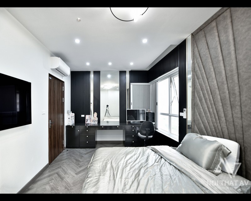 Phòng ngủ còn được trang trí thêm bàn trang điểm kết hợp bàn làm việc sử dụng gỗ mdf với tấm mdf đen kết hợp nẹp chỉ gương. Phần dưới bàn có nhiều ngăn để gia chủ đựng được nhiều đồ, từ đó giúp căn phòng luôn gọn gàng.