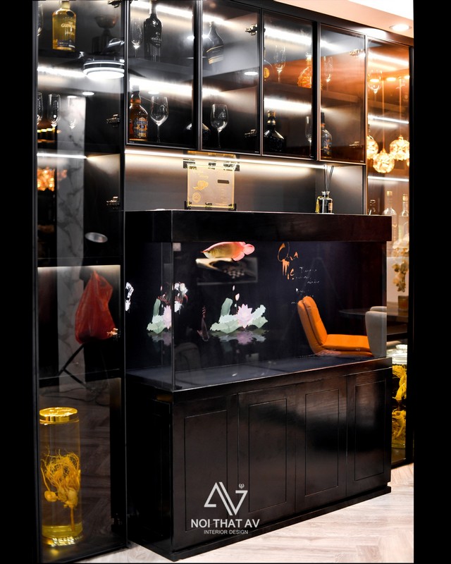 Hệ tủ rượu cánh kính gắn thiết kế rỗng khoảng giữa để đặt bể cá