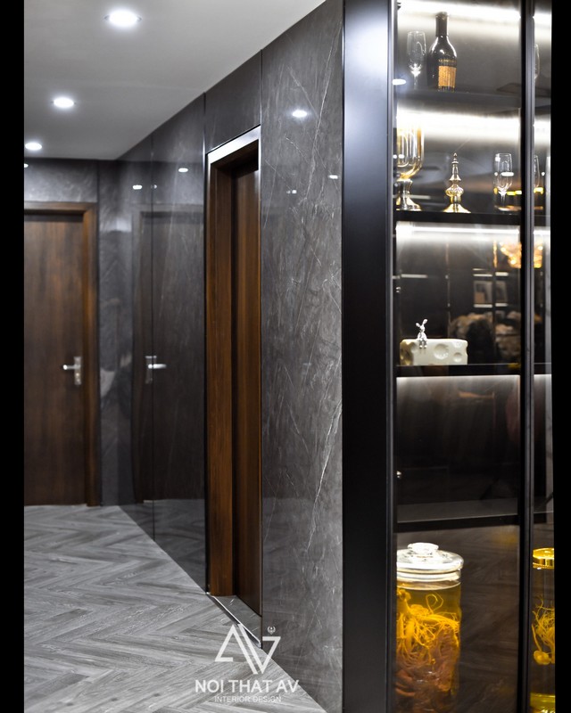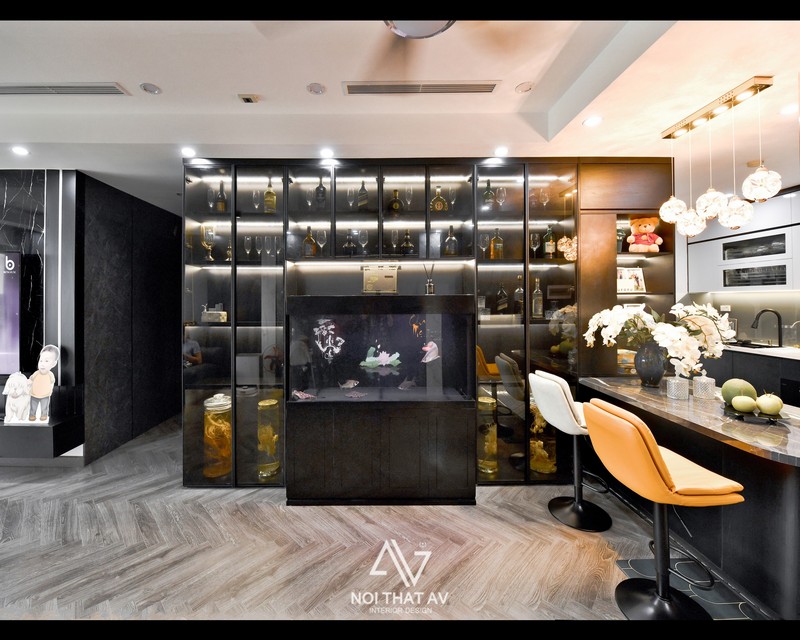 Nối liền phòng khách và bếp là tủ rượu được thiết kế với độ sâu 35cm. Những chai rượu quý cùng ly rượu được trưng bày ở đây cho thấy chủ nhà là người sành rượu và thích sưu tầm rượu.