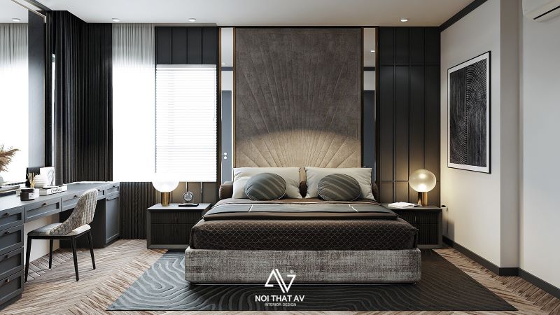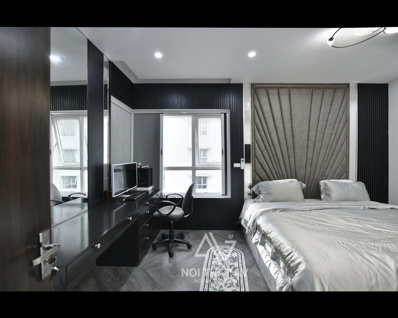 Phòng ngủ Master có sự kết hợp giữa các gam màu sáng tối, trong đó màu đen xám là chủ đạo