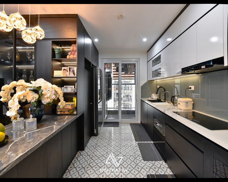 Hệ tủ bếp trên dưới được làm từ gỗ mdf phủ melamin với khoang chậu rửa, khoang giá xoong dưới bếp Picomat và bàn đảo bếp Mini bar. Nhờ thiết kế này khi bước vào đây bạn có cảm giác như đang được chiêm ngưỡng quầy bar thu nhỏ, đẹp đẽ, sạch sẽ với đầy đủ tiện nghi.