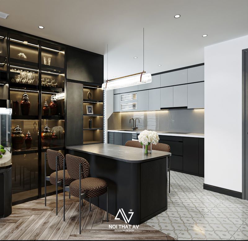 Bàn đảo kiêm bàn ăn và gắn liền với tủ rượu